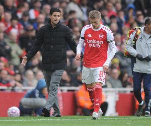 本輪英超阿森納2-0西漢姆聯,厄德高上半場第19分鐘與對手膝對膝碰撞,隨后繼續在場上堅持了10分鐘后被傷退離場。